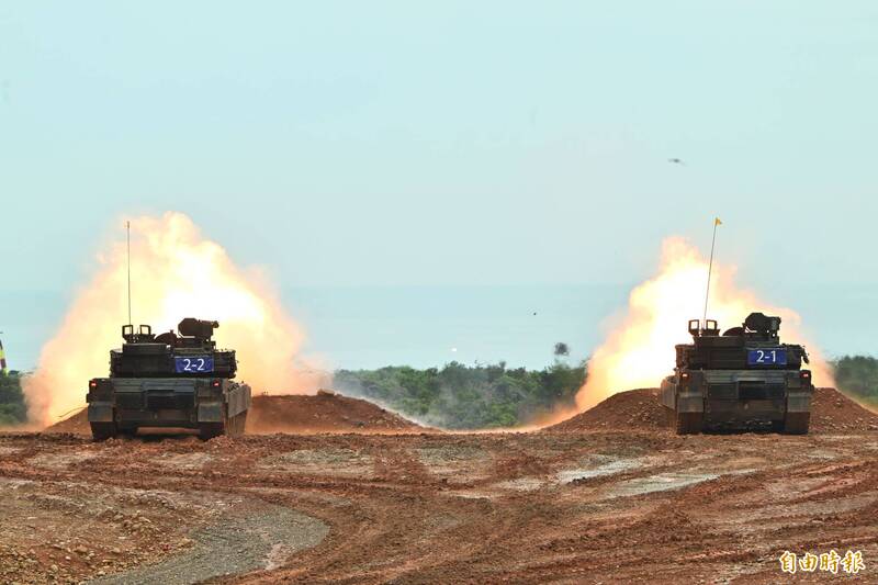 兩輛M1A2T戰車為一組,鎖定標靶同步射擊。(記者田裕華攝)